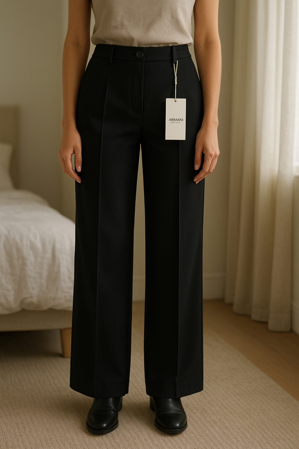 Vintage Armani Collezioni - Black Wide Leg Trousers IT 40 / EU 36 in piedi, rivolto verso la fotocamera, in una camera da letto con luce soffusa e luce naturale che filtra dalla finestra.