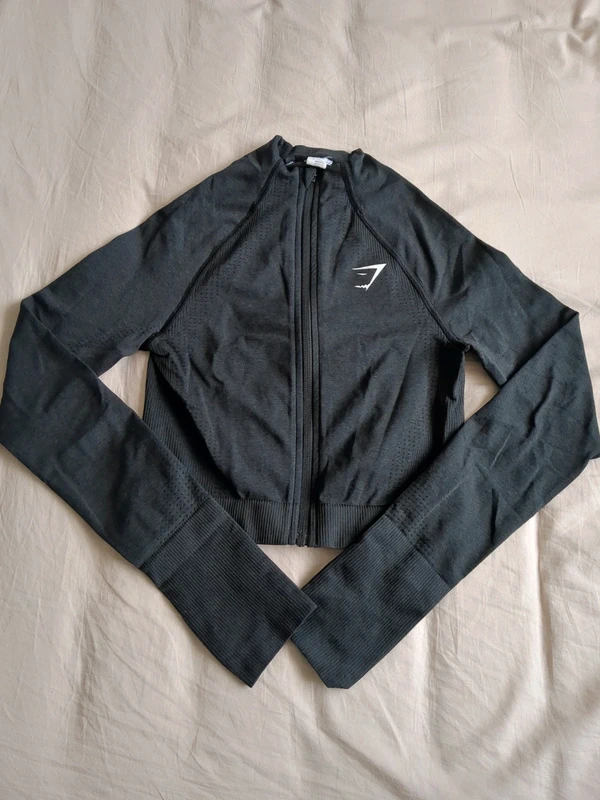 - I'm selling: Black Gymshark cropped zip jacket, size S - Women's cropped, long sleeves, fitted style - Stretchy tech fabric with perforated side panels - Front zip, white Gymshark logo on chest - Great condition, cleaned, smoke-free home - Ships within 48h