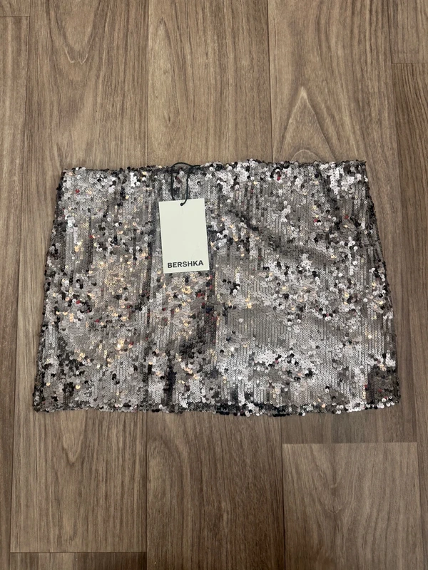 - Je vends jupe Bershka à paillettes, taille L - Mini-jupe coupe droite, couvre hanches et haut des cuisses - Recouverte de paillettes argentées irisées, reflets multicolores - Base synthétique avec doublure; étiquette Bershka visible - État: neuve avec étiquettes, jamais portée