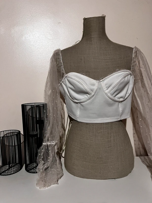 - Je vends Top bustier court blanc ivoire XL, Shein - Corset structuré, bonnets moulés; tissu stretch satiné - Manches longues off-shoulder en tulle à pois, léger bouffant - Très bon état, peu porté; look romantique - Envoi rapide et soigné, non-fumeur - Prix ~7€