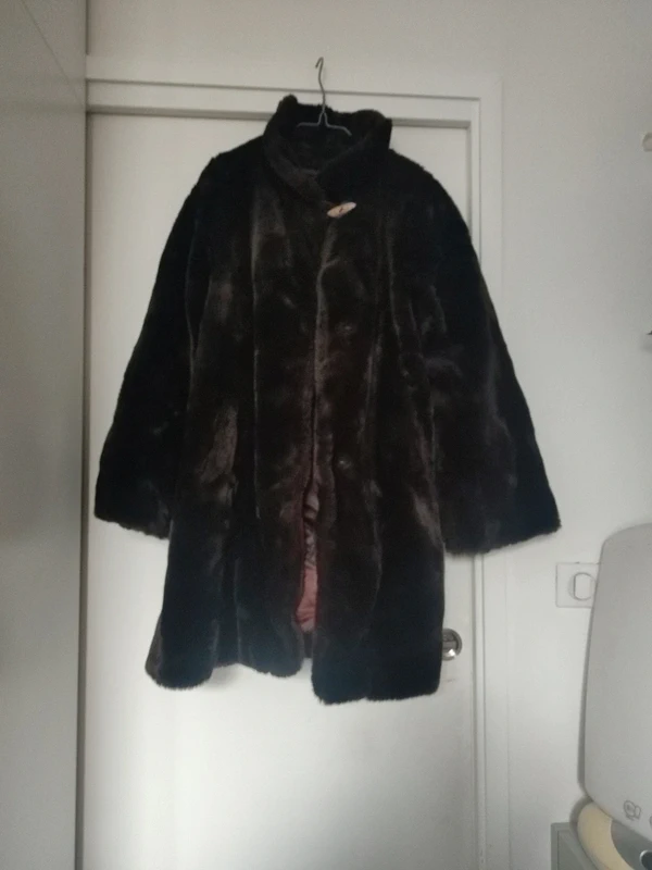 - Je vends ce manteau fausse fourrure Lafayette, 38/40, mi-cuisses, col montant. - Couleur brun foncé, doublure bordeaux visible. - Très chaud, coupe ample. - Défaut: déchirure sur la doublure (16 cm) près de la couture droite. - Fourrure OK, pas d’usure sur le pelage.