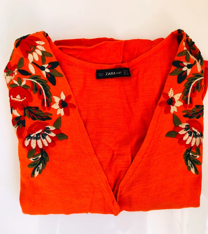 Robe de la marque Zara de couleur orange vif et 100% coton. Coupe flatteuse patineuse avec beau décolleté (j’ai fait un point de couture pour qu’il ne soit pas trop profond mais peut être enlevé très facilement avec des ciseaux). Broderie de fleurs 🌸 sur les côtés de la poitrine. Parfaite pour l’été mais peu portée car trop décolletée pour moi même avec le point.