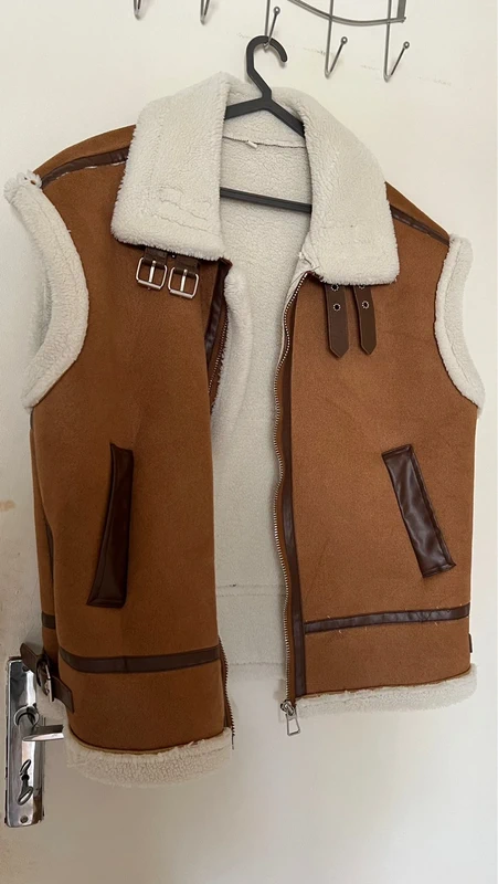 Je vends gilet aviator sans manches en suédine cognac, fourrure crème - Taille unique (34/36, oversize) - Zip central, poches latérales avec bord brun - Boucles métal, liserés, fourrure au bas - Très bon état, servi 4/5 fois, aucun défaut - Aucune marque visible