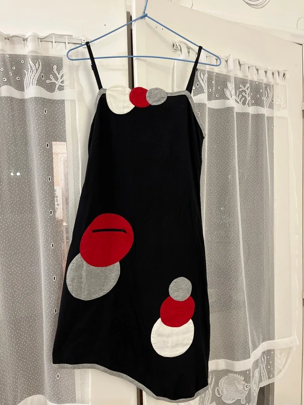 - Je vends robe Akmandu, taille S - Robe femme à fines bretelles, coupe trapèze courte avec biais gris - Noir coton/jersey, décolleté droit, ourlet asymétrique - Déco graphique: appliqués circulaires diagonaux rouge/gris/blanc; rond rouge avec passepoil - État correct, portée légère, agréable à port
